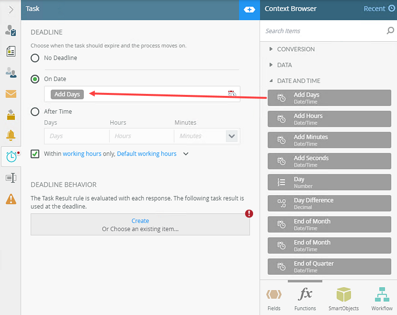 - You can drag dynamic values into the On Date field. From the Context Browser, select and drag inline functions from the Functions, Fields, SmartObjects and / or Workflow categories to define the specific date field.