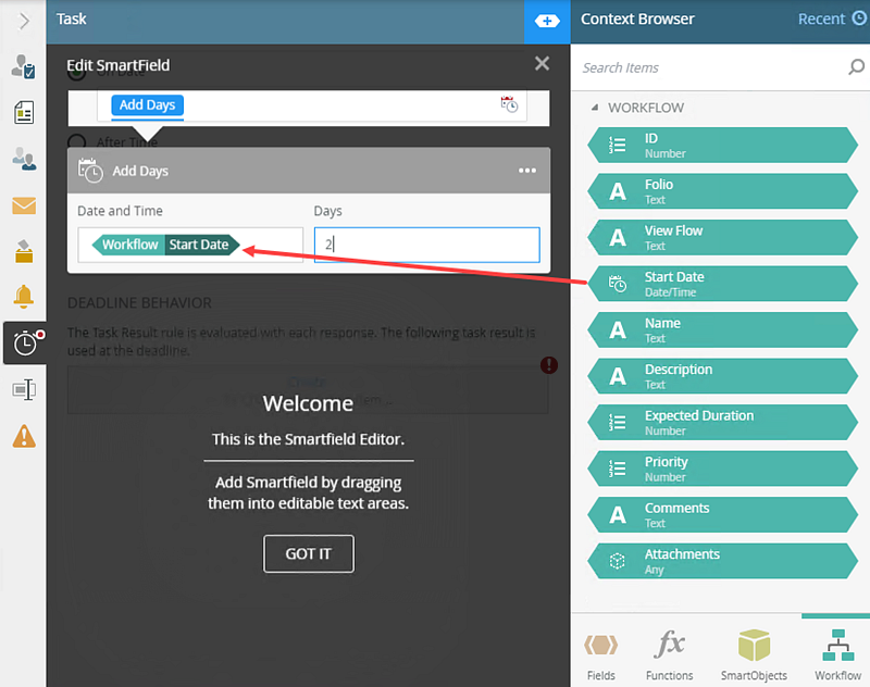 - The Smartfield Composerdisplays. Use the Context Browser to drag fields and functions to define your deadline date.