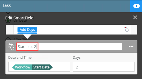 | On Date | Specify a date and time for the deadline. You can also specify a dynamic value, for example by using a function or SmartObject method that returns a date and time. |