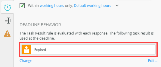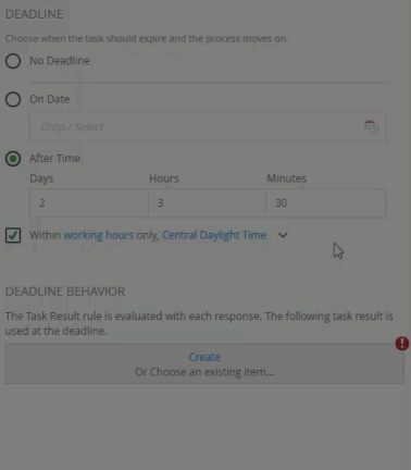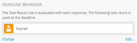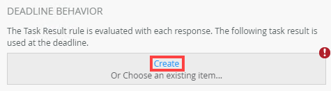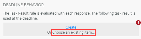 - From the Deadline Behavior section, choose to evaluate theTask Result Rule with each response. Specify or create the task result to use the task deadline is reached. To select an existing result, click the Choose an existing item... link. You can use linked or unlinked results.