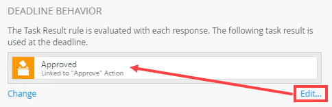 - Notice the deadline result is linked to the deadline. To edit the deadline result label, click the Edit link. Click the Change link to select a different deadline result. Changing the label name does not update the linked task result action on the Task Detail.