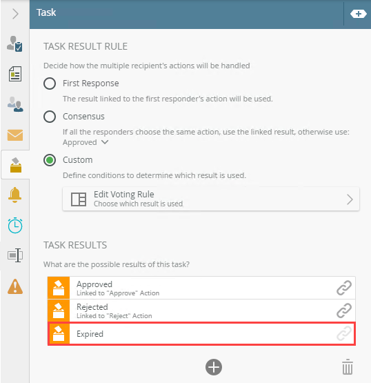 - You can use the Expired result as an unlinked task result action on the Task Result Rule tab.