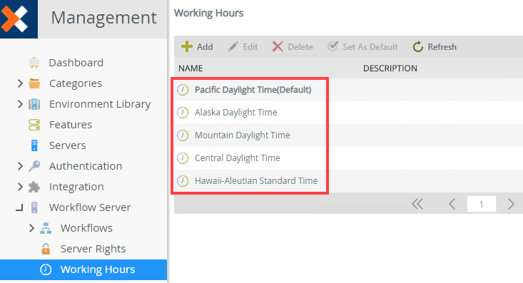 - You can define working hours on your environment to store the working hours for your organization, or to create different zones for different departments and offices in the organization. To configure them, click the working hours link. You must have access and admin permissions in Management to set the working hours. For more information on how to set your working hours see Work Hours. In this example, five different working hours are available in your organization.