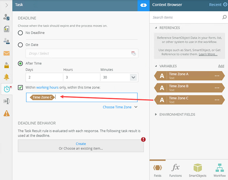 Within working hours only allows you to set the deadline to take the specified working hours into account when calculating when the deadline should run. This function applies when either the On Date or After Time option is selected. If you select one of these options, the deadline will take working hours into consideration. If you don't select the Within Working Hours only option, the deadline does not take working hours into consideration (so in some cases, the deadline occurs sooner. For example: suppose that you configure a deadline to expire the task after 30 minutes. You also configure this deadline within working hours, and you selected the Sales team working hours zone, which is set up as Monday through Friday, 8 am - 5 pm. To define the working hours for your organization, click the working hours link. You must have access to, and admin permissions in, Management to set the working hours. For more information on how to set your working hours see Work Hours. Keep in mind that working hours are based on static time zones because you select a specific time zone when defining the working hours. If you want the time zone to be dynamic and change depending on some condition (such as a user's geographical location), select the Type/Construct my own option to add logic that determines which working hours configuration to use when calculating the time limit. Select the Type/Construct my own option to configure which working hours should apply to the deadline. You can use this approach to specify a dynamic value for the working hours, based on some logic. This option is useful when you have global users across multiple time zones. You can, for example, use the result of a SmartObject method and/or functions to determine where a specific user is based, return the name of that working hours zone, and then use the returned working hours zone value in the Within working hours only option to match their location. Type values or create dynamic values by dragging Functions, Fields, SmartObjects and Workflow-related items from the Context Browser into the fields. The Default working hours menu has a list of defined working hours. If you have not defined any working hours, the Default working hours option is selected. By default, the Within Working Hours Only option is checked. |