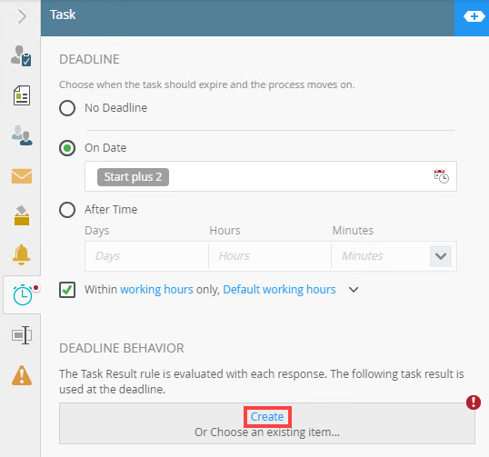 Click the Expire on Deadline option. Click Create to create or select a task result action. Click the Choose an existing item... link to select a task result action. |