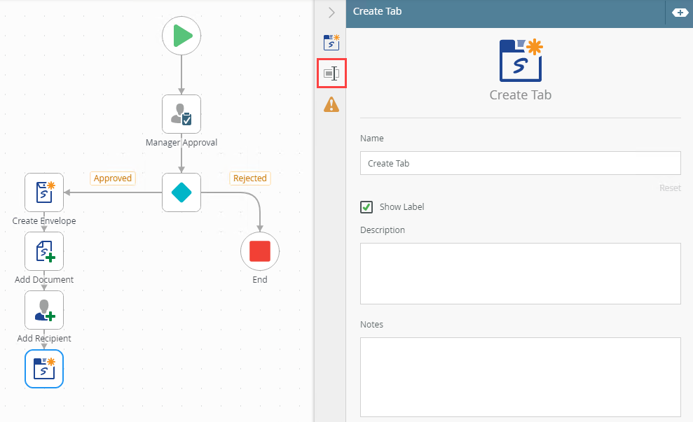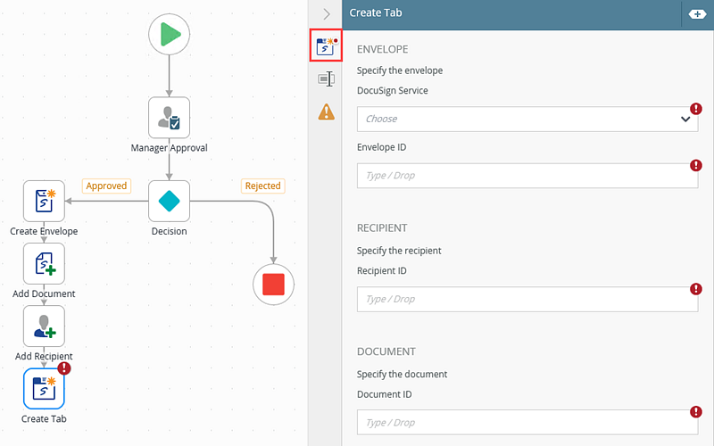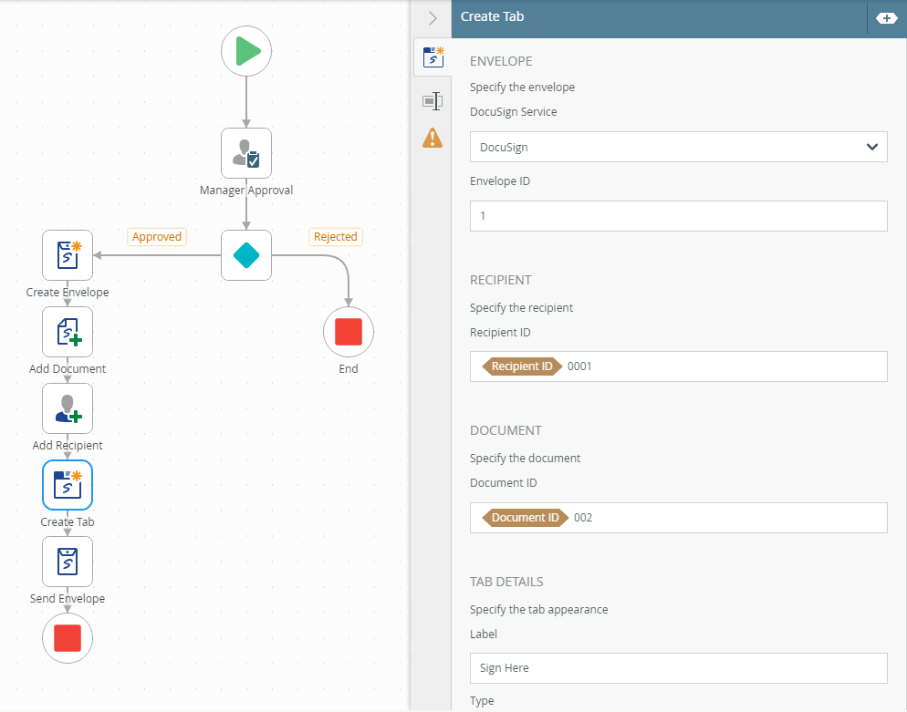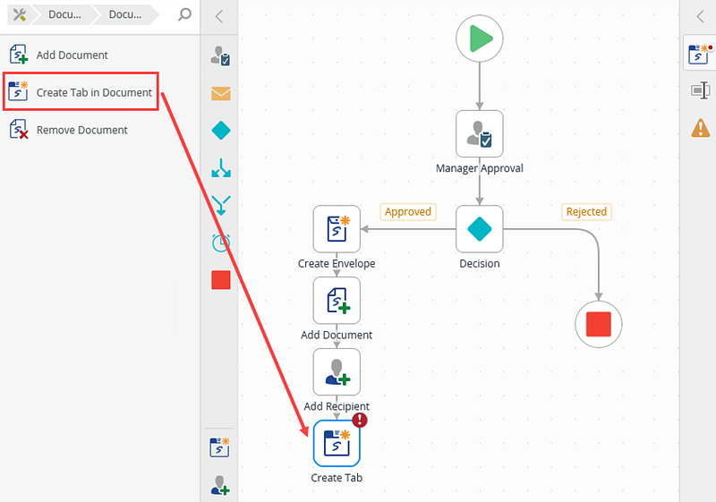 You can, for example, use the Create Tab in Document step to create a tab in the document to indicate signers where to sign. Drag the Create Tab in Document step from the DocuSign category, Favorites bar, or the Recent category onto the canvas.