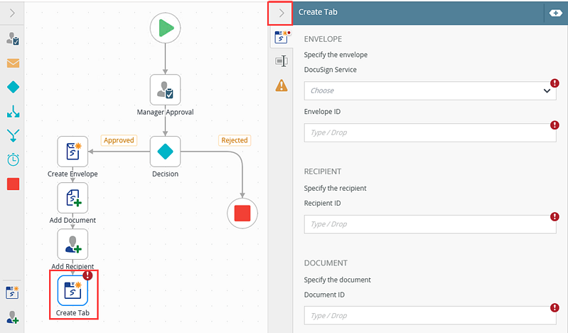 - From the Toolbox click the DocuSign category, the Document category and then drag the Create Tab in Document step onto the canvas.