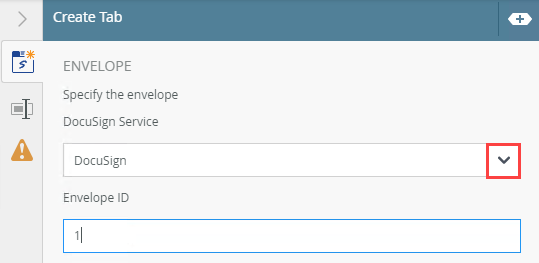 - Select the Create Tab tab. Use this tab to configure the DocuSign service instance, envelope ID, recipient ID, document ID, tab details, tab position, and the return property mappings.