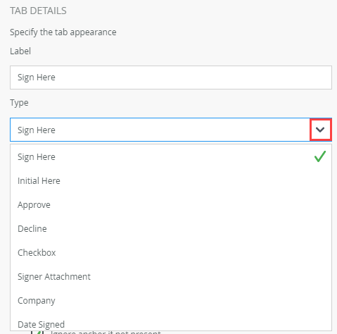 | Type | Allows you to select the type of tab to add to the document. The following types are typically available: • Name • Approve • Checkbox • Company • Date • DateSigned • Decline • EmailAddress • FirstName • FullName • InitialHere • LastName • Note • Number • SignerAttachment • SignHere • SSN • Text • Title • Zip | Select the tab type from the menu. |