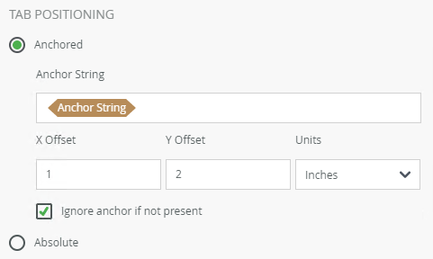 - In the Tab Positioning section, specify where on the document the tab shows. Add the Anchor String, X Offset, Y Offset and Units. Check the check box if you want to ignore the anchor values.
