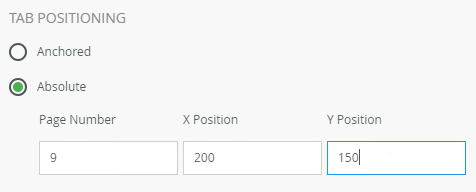 - Select the Absolute radio button to create a tab on a specific page in the document. Add the Page Number, X Position and Y Position.