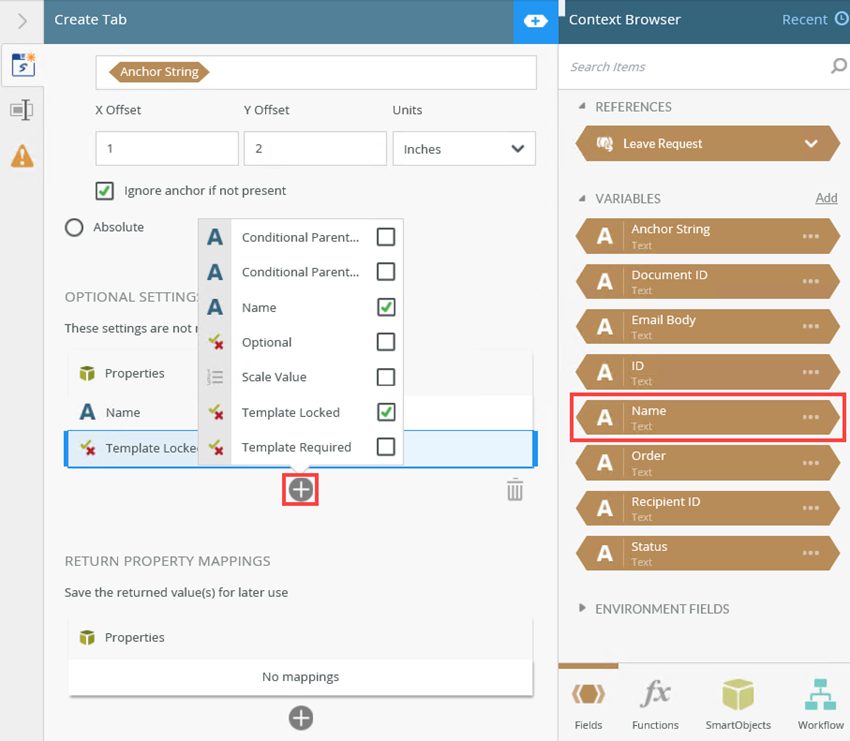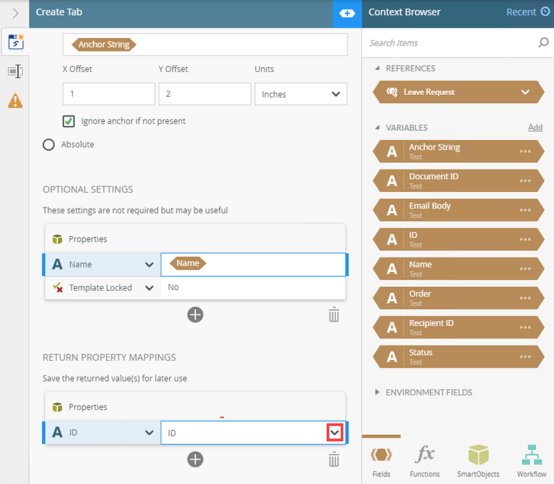| Anchor String | Allows you to specify the anchor text for placing the tab in the document. | Type values or create dynamic values by dragging Functions, Fields, SmartObjects and Workflow-related items from the Context Browser into the fields. When a SmartObject Load method property is used, an input property is required for the correct data to load. |