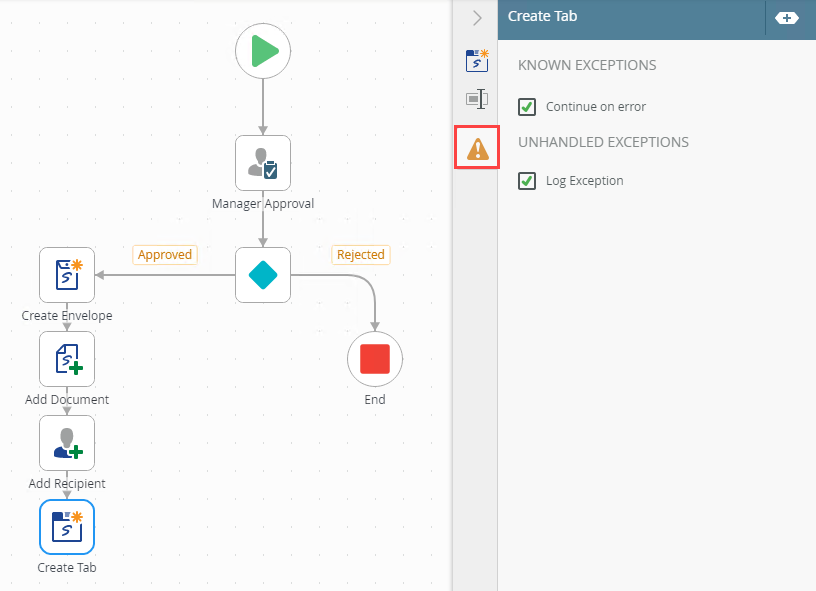 - The exceptions in the table above is an example of those available in Workflow steps. The exceptions available depend on the Workflow step used in the design canvas.