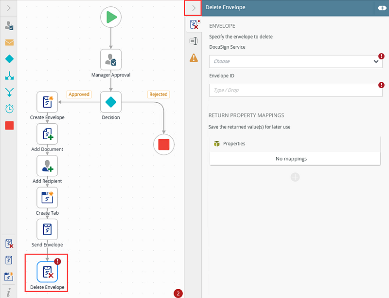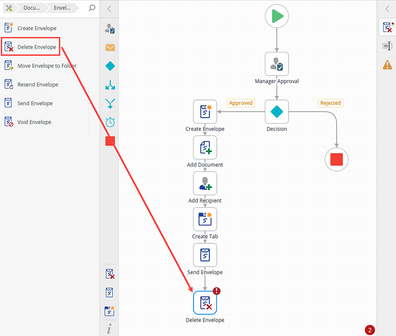 - From the Toolbox click the DocuSign category, the Envelope category and then drag the Delete Envelope step onto the canvas.