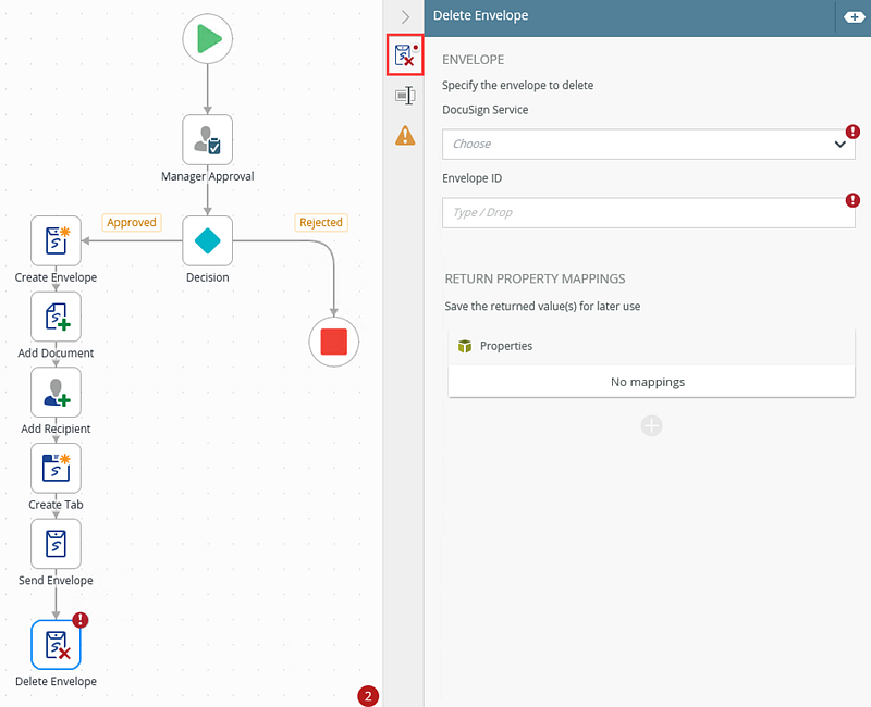 - Select the Delete Envelope tab. Use this tab to configure the DocuSign service instance, envelope ID, recipient ID, optional settings, and the return property mappings.
