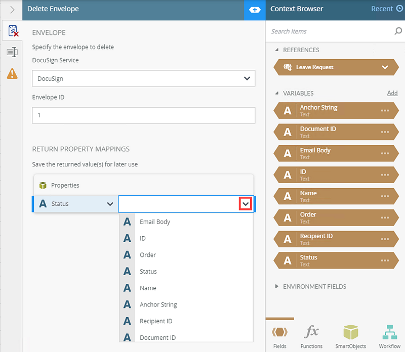 - From the DocuSign Service menu, select the service instance. Add the Envelope ID and type a value, use inline functions, or use dynamic fields by clicking the expand or collapse toggle to expand the Context Browser. Within the Context Browser, select inline functions from the Functions, Fields, SmartObjects or the Workflow categories to define your function. Click and drag the function on to the field.