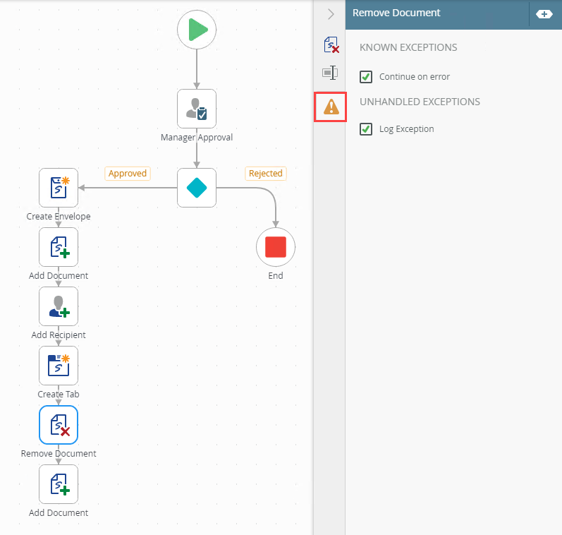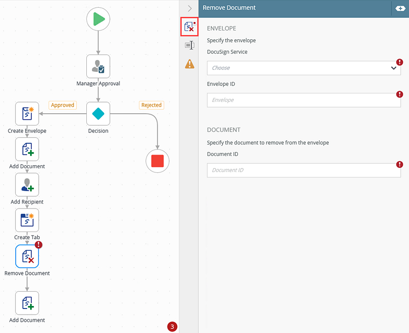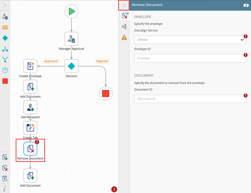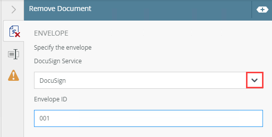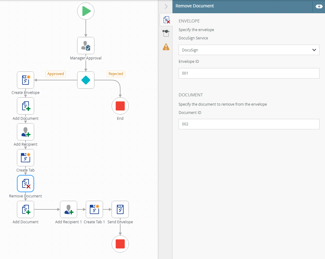 - Select the Remove Document tab. Use this tab to configure the DocuSign service instance, envelope ID, and document ID.