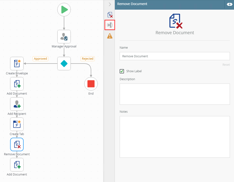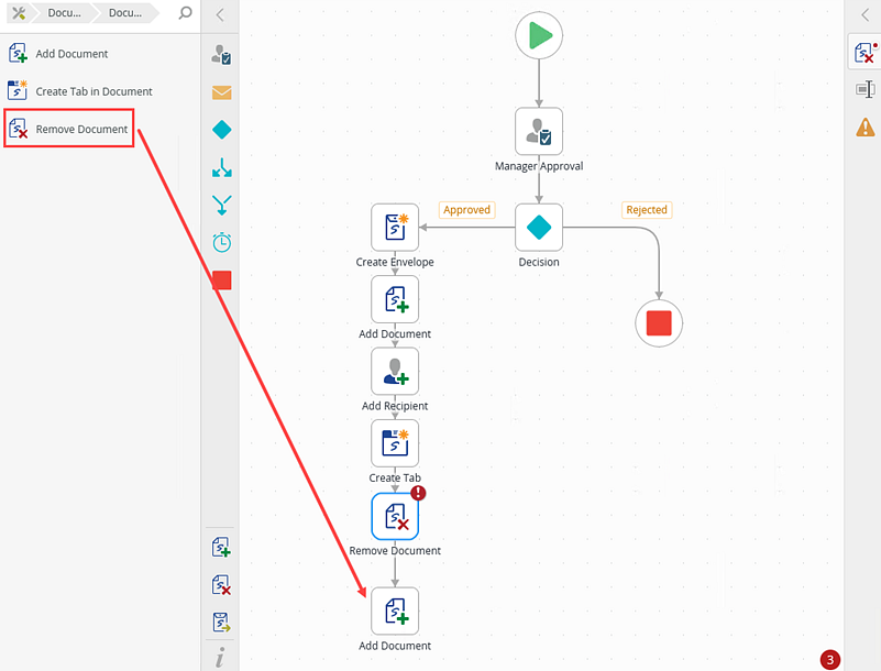 - From the Toolbox click the DocuSign category, the Document category and then drag the Remove Document step onto the canvas.