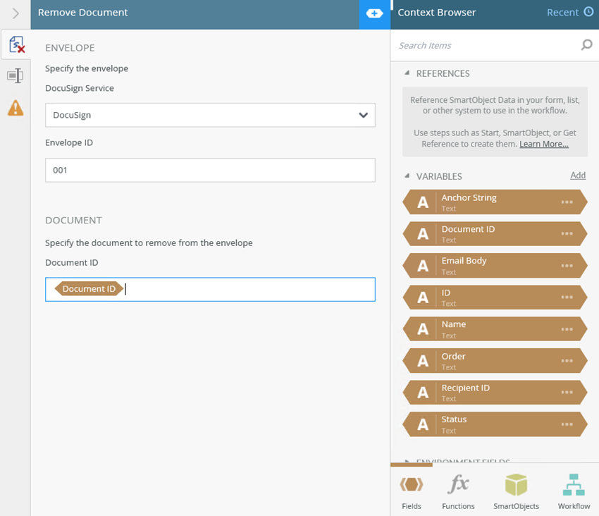 | Document ID | Allows you to specify the ID of the document to be removed from the envelope. Use a non-negative, whole number as the ID. You can instead use a variable, created earlier in the workflow with the Add Document's return property mappings, to specify the ID. | Type values or create dynamic values by dragging Functions, Fields, SmartObjects and Workflow-related items from the Context Browser into the fields. When a SmartObject Load method property is used, an input property is required for the correct data to load. |