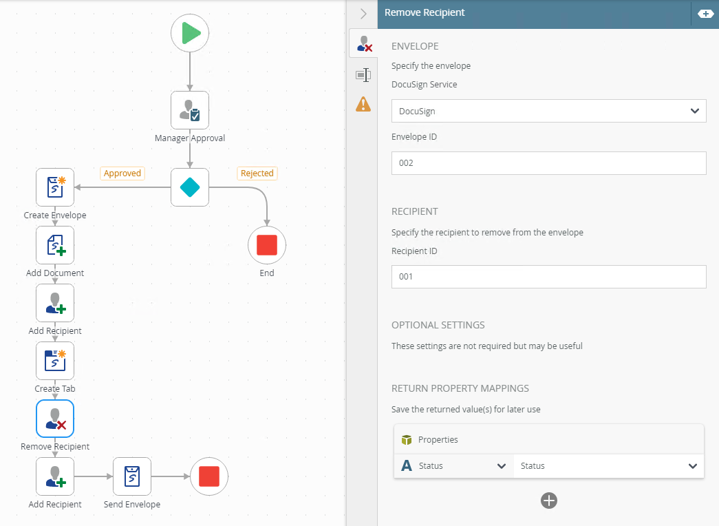 - Select the Remove Recipient tab. Use this tab to configure the DocuSign service instance, envelope ID, recipient ID, and the return property mappings.
