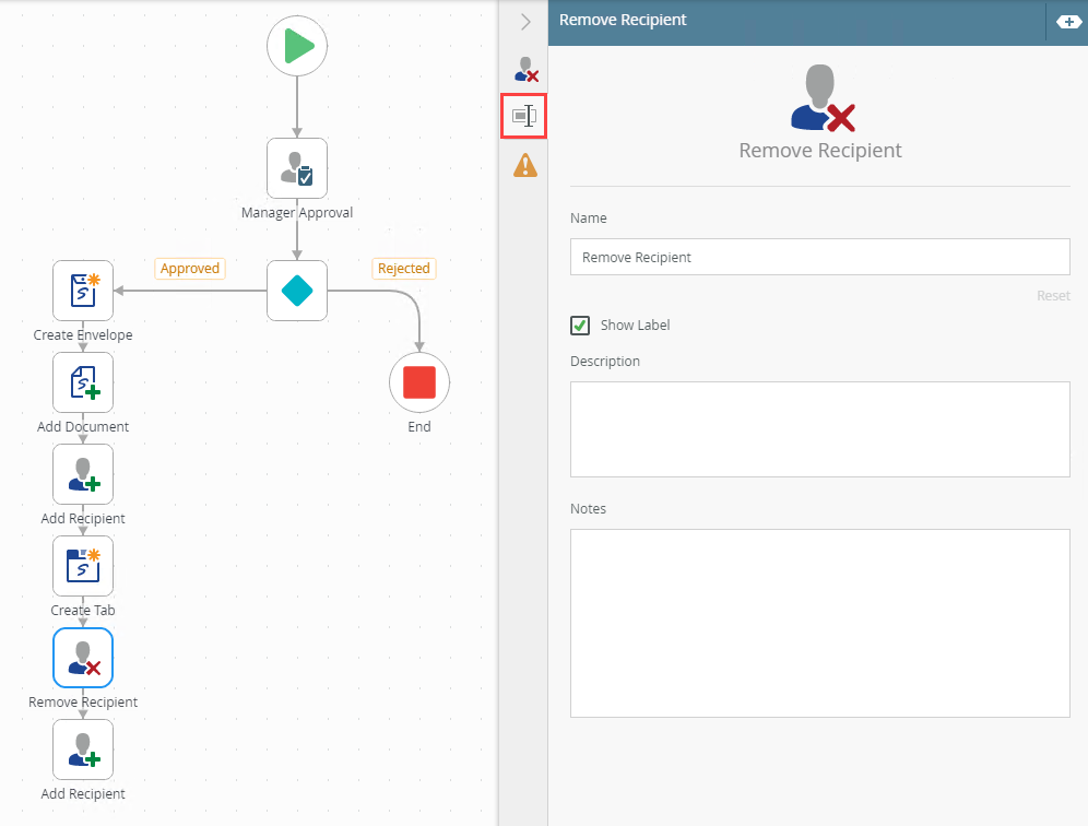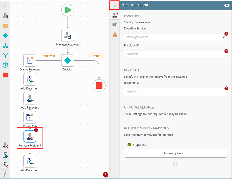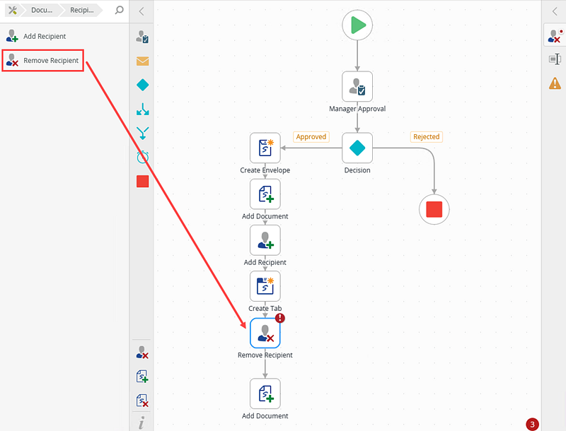 - From the Toolbox click the DocuSign category, the Recipient category and then drag the Remove Recipient step onto the canvas.