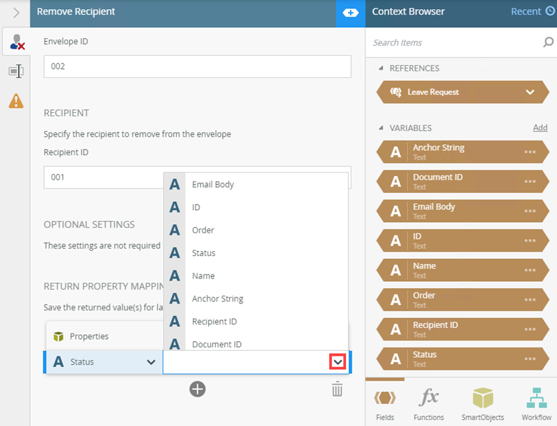 | Recipient ID | Allows you to specify the recipient to be removed from the envelope. Type a value or use the variable created for the return property in the Add Recipient step. | Type values or create dynamic values by dragging Functions, Fields, SmartObjects and Workflow-related items from the Context Browser into the fields. When a SmartObject Load method property is used, an input property is required for the correct data to load. |