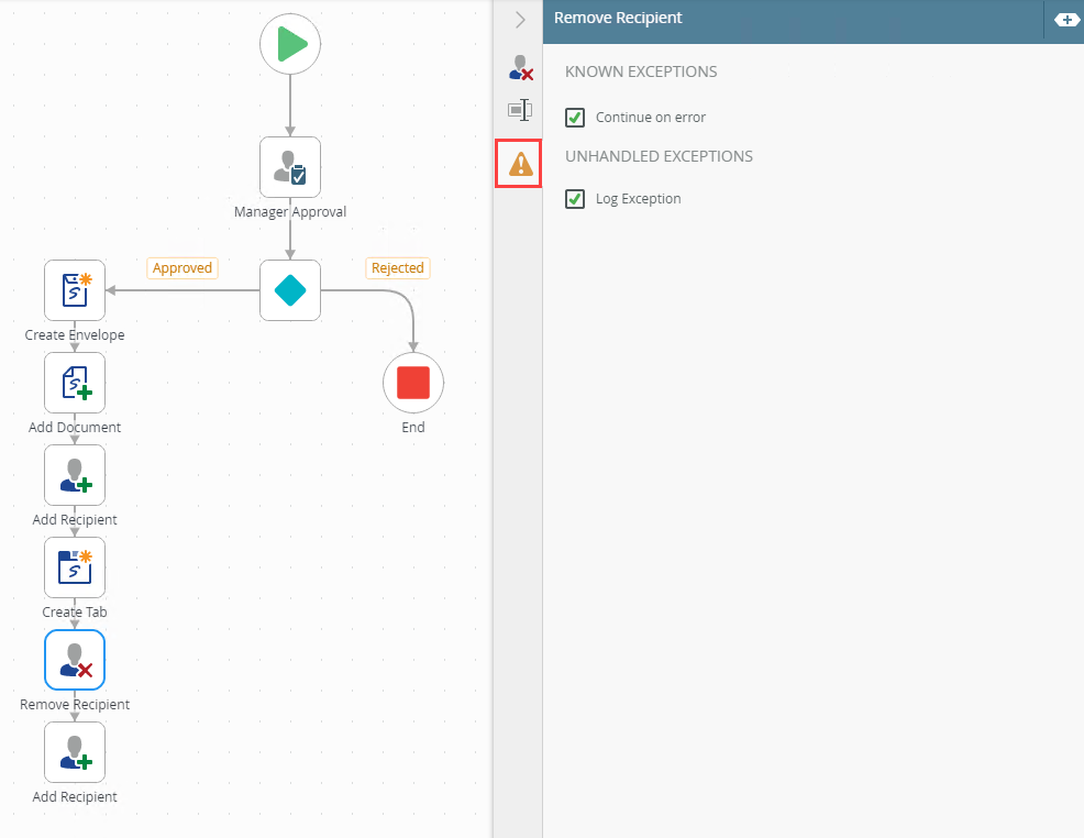 - The exceptions in the table above is an example of those available in Workflow steps. The exceptions available depend on the Workflow step used in the design canvas.