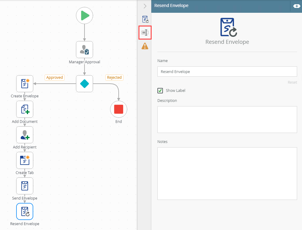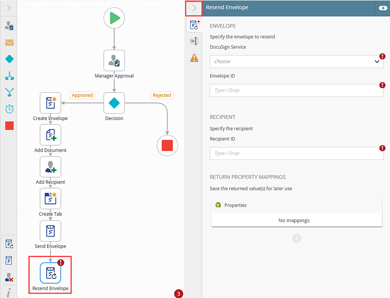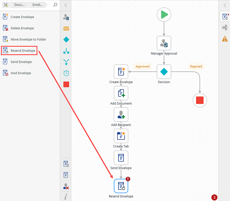 - From the Toolbox click the DocuSign category, the Envelope category and then drag the Resend Envelope step onto the canvas.
