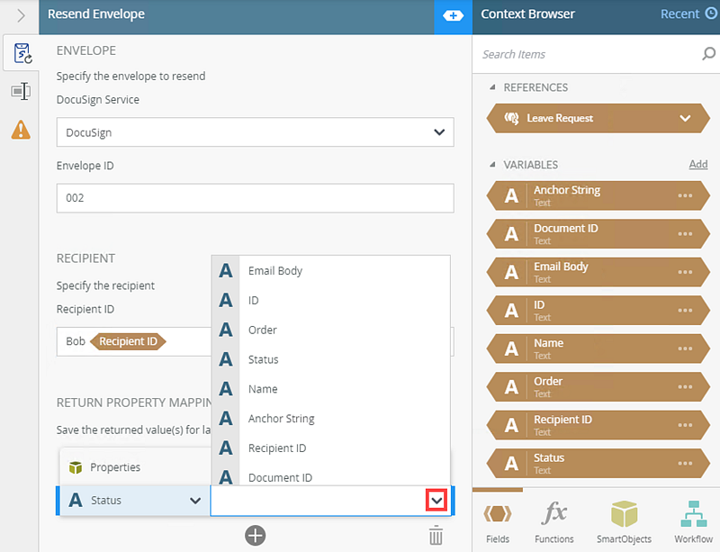 - From the DocuSign Service menu, select the service instance. Add the Envelope ID and type a value, use inline functions, or use dynamic fields by clicking the expand or collapse toggle to expand the Context Browser. Within the Context Browser, select inline functions from the Functions, Fields, SmartObjects or the Workflow categories to define your function. Click and drag the function on to the field.