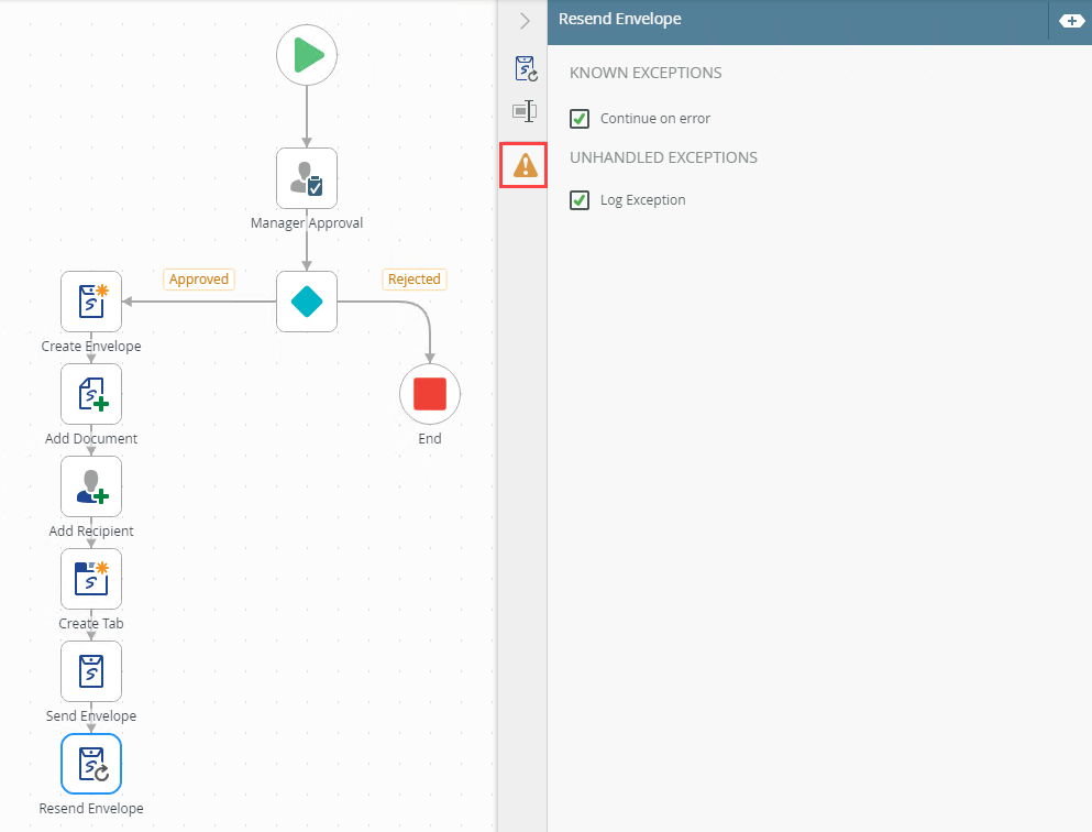 - The exceptions in the table above is an example of those available in Workflow steps. The exceptions available depend on the Workflow step used in the design canvas.