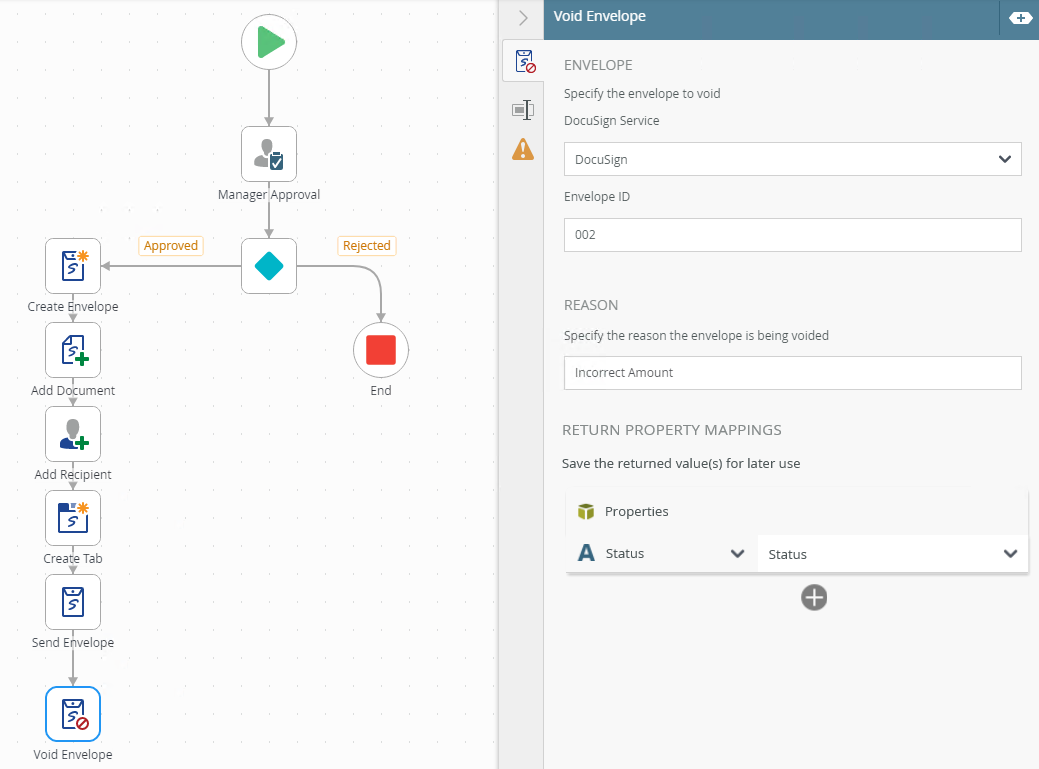 Use the Void Envelope step to cancel a DocuSign envelope that is no longer needed.