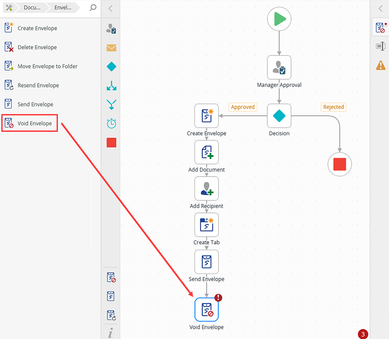 Drag the Void Envelope step from the DocuSign category, Favorites bar, or the Recent category onto the canvas.