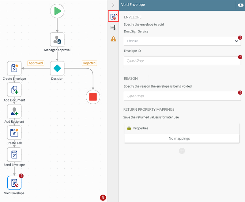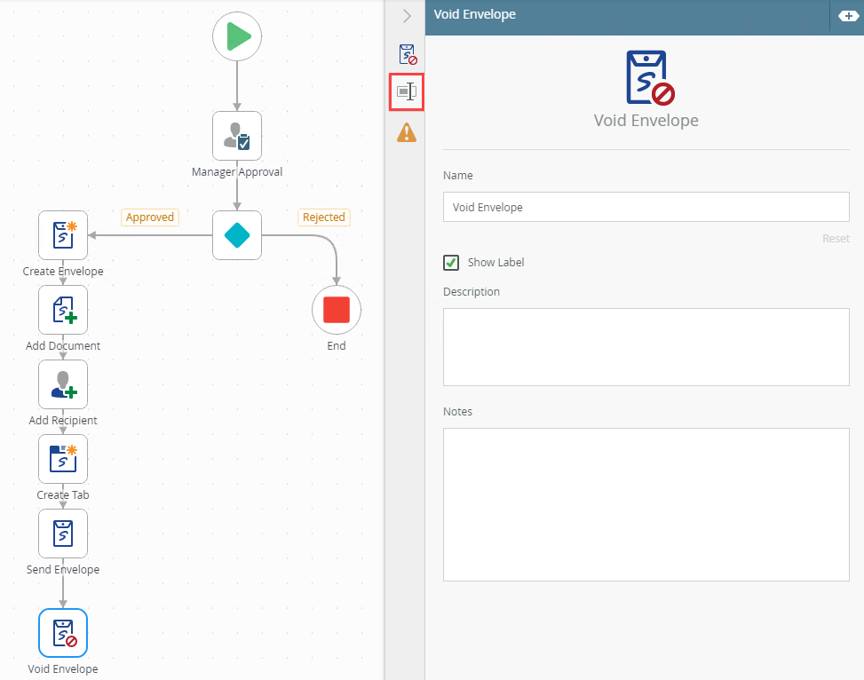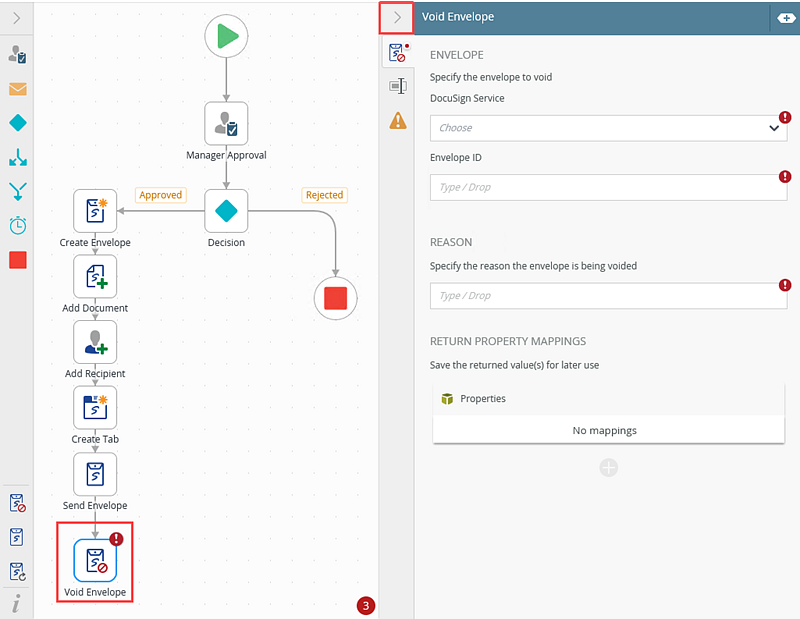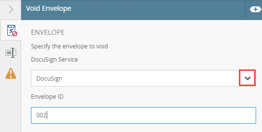 - From the Toolbox click the DocuSign category, the Envelope category and then drag the Void Envelope step onto the canvas.