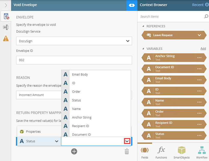 | Reason | Allows you to specify the reason for voiding the envelope. | Type values or create dynamic values by dragging Functions, Fields, SmartObjects and Workflow-related items from the Context Browser into the fields. When a SmartObject Load method property is used, an input property is required for the correct data to load. |