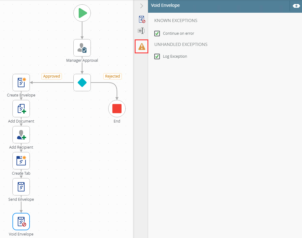 - The exceptions in the table above is an example of those available in Workflow steps. The exceptions available depend on the Workflow step used in the design canvas.