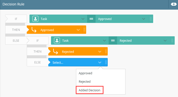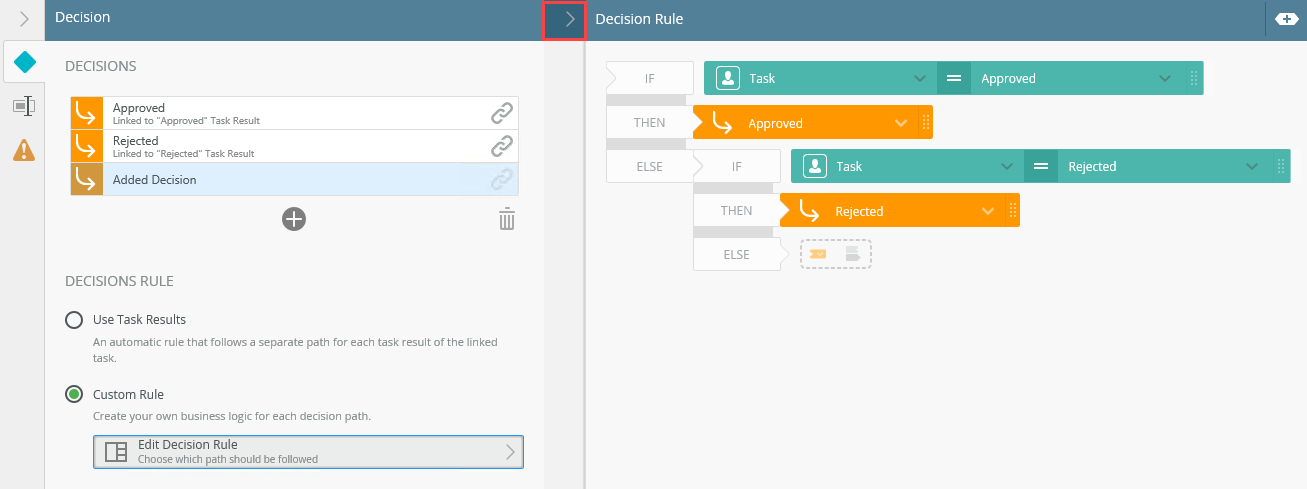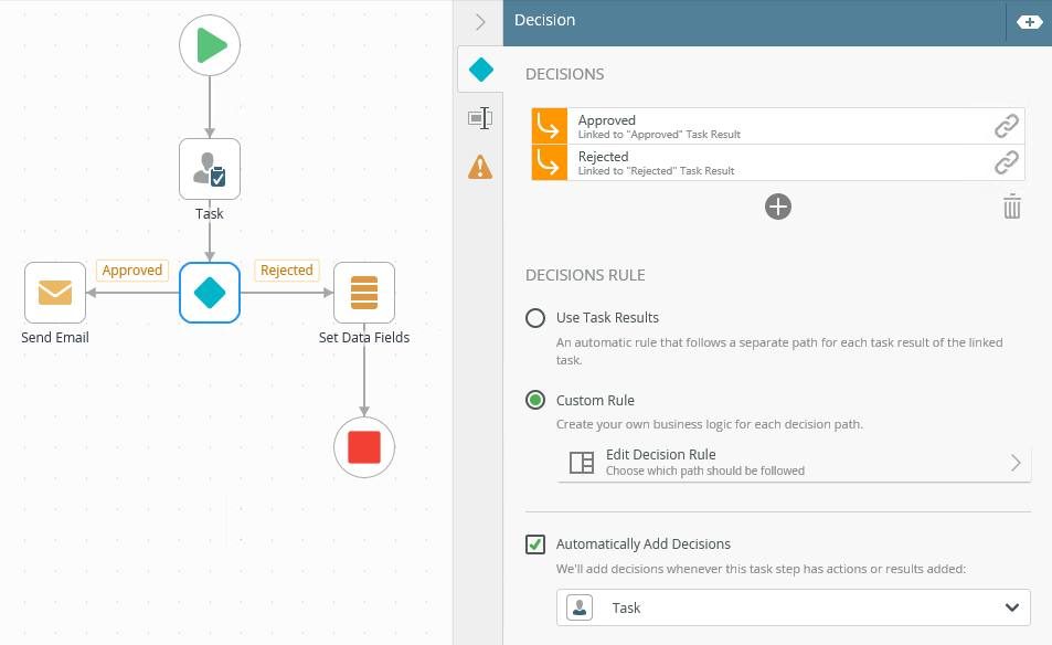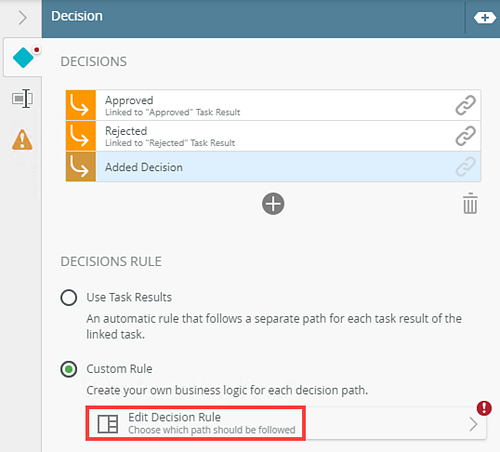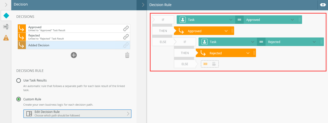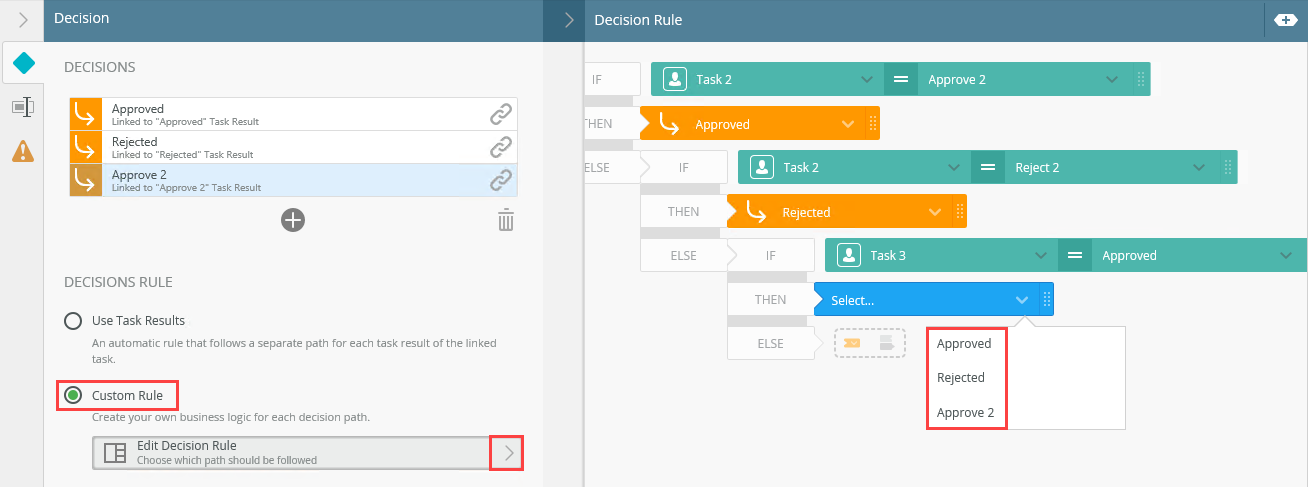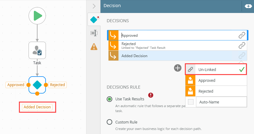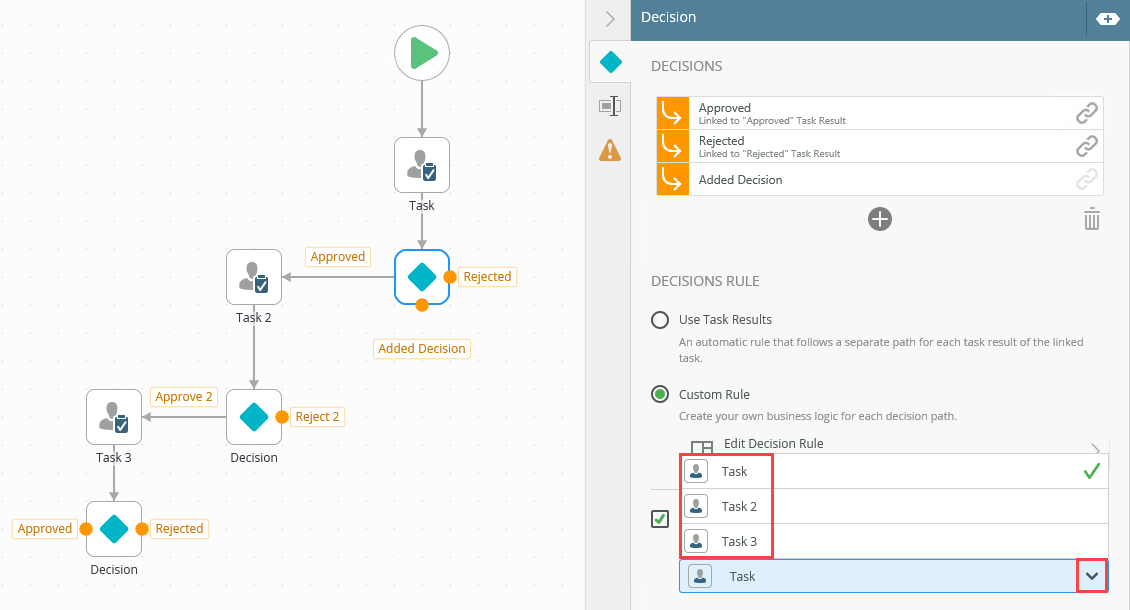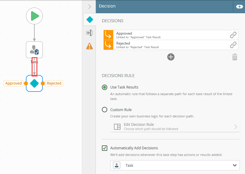 - Due to the new decision, you can no longer use the Use Task Results decision rule. You must select the Custom Rule radio button and create your own custom Decision Rule using the Rules Designer.