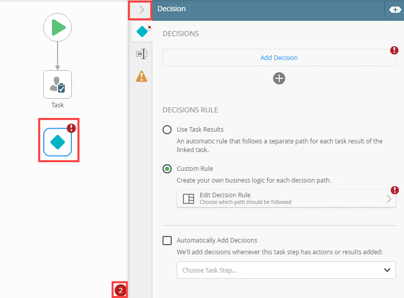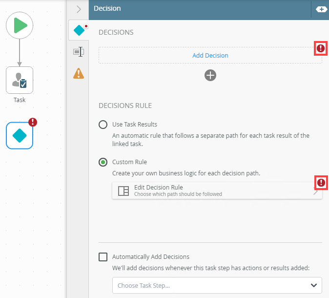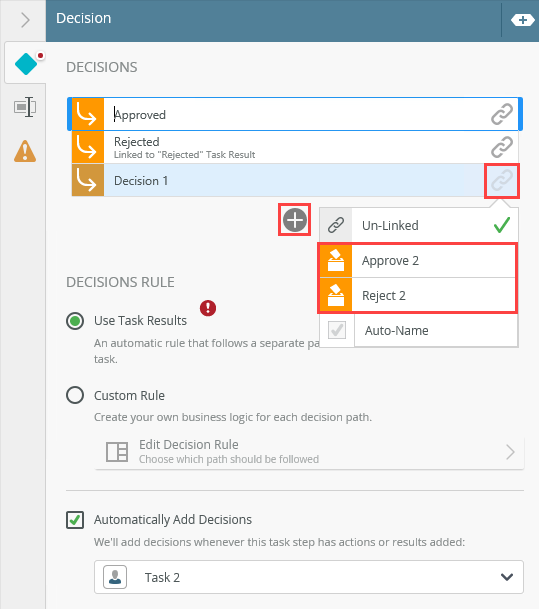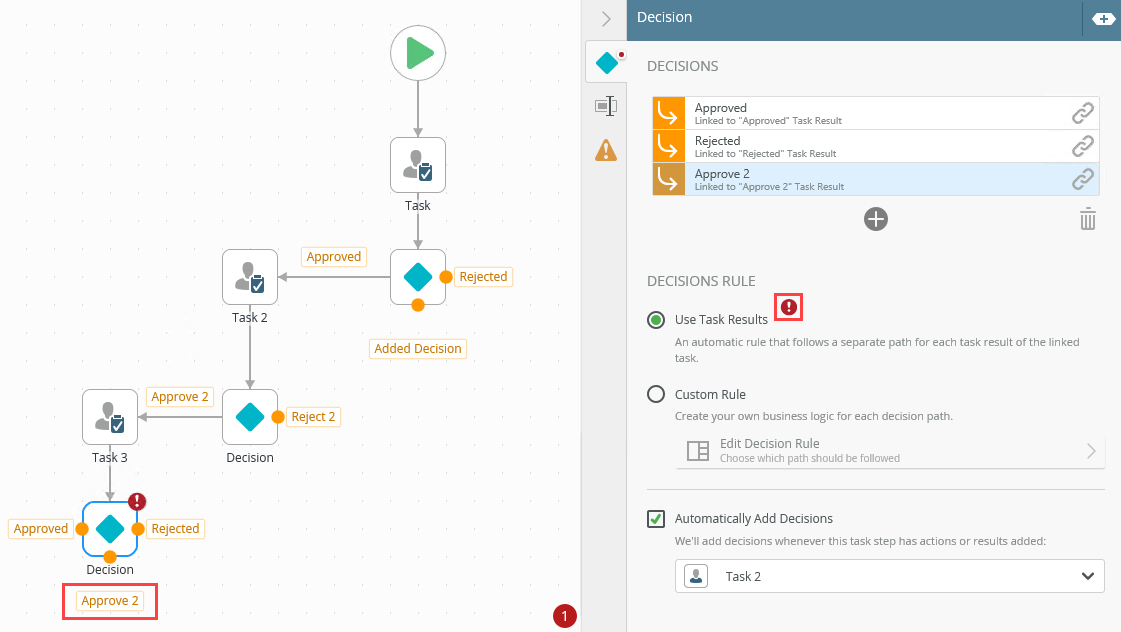 - Select Approve 2. Notice the new port on the Decision step. Also notice the error indicator on the decision step and the Use Task Results.