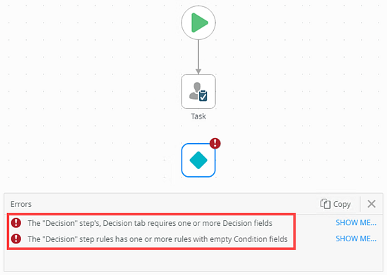 - Copying and pasting decision steps with identical names will prevent the workflow from deploying.