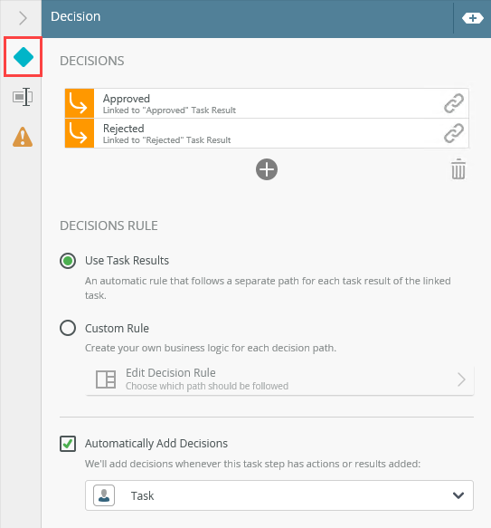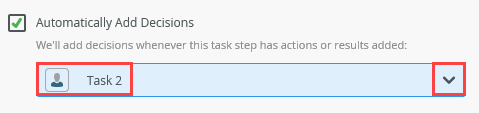- The Automatically Add Decisions section shows the task the decision is linked to. This option is enabled by default if the decision step is linked to a task. The linked task name shows in the menu. Any other tasks placed on the canvas show in this menu.