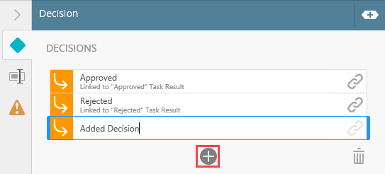 | Add button | Allows you to add additional decisions. You may want to add all decisions as task actions, but you can also add unlinked decisions. | Click Add to add a decision. |