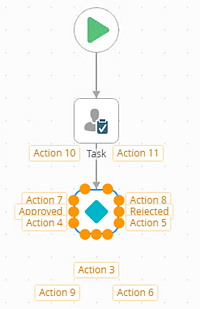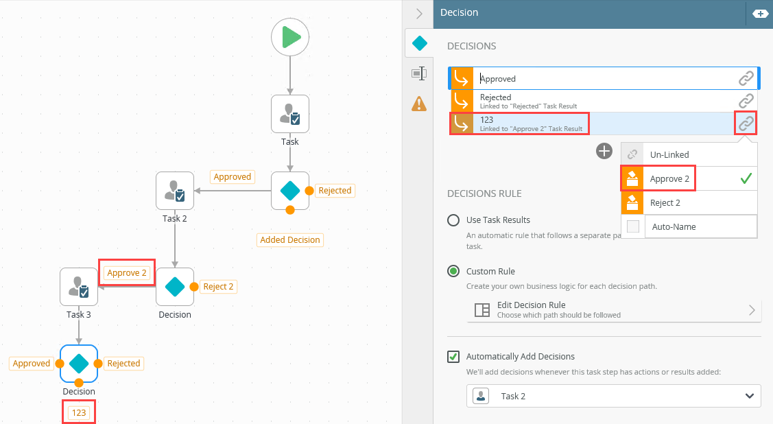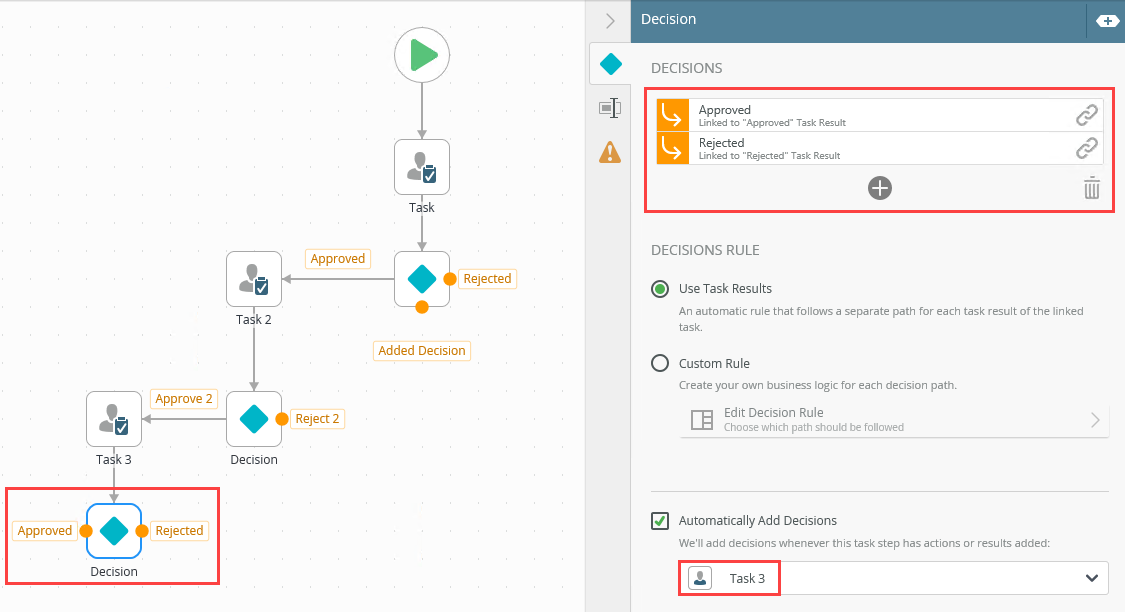 - You can use Task Actions from another task and link them to a Decision step. In this example, you want to add the decisions from Task 2 to the decisions on the Decision step linked to Task 3. This is a easy way to add actions and decisions from other Task steps without having to add or retype them. Select the Decision step linked to Task 3. Notice the Approved and Rejected decisions.