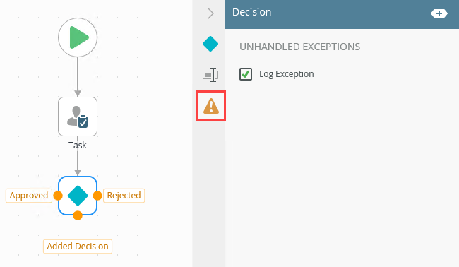 - The exceptions in the table above is an example of those available in Workflow steps. The exceptions available depend on the Workflow step used in the design canvas.