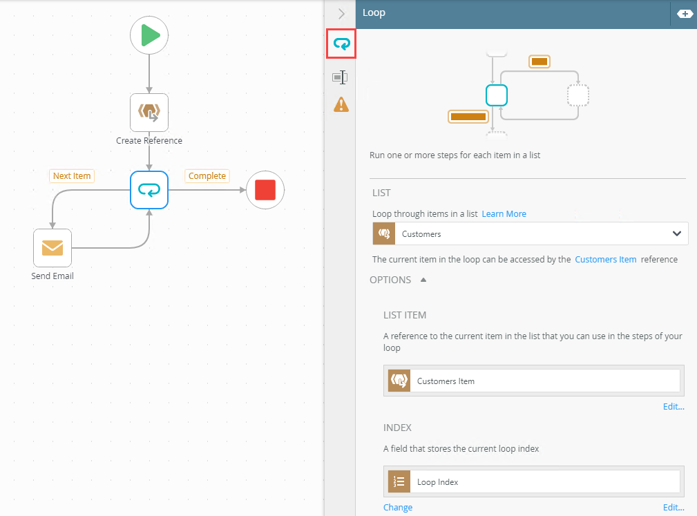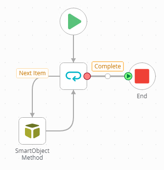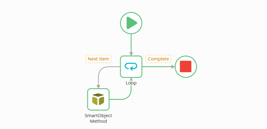 Use the Loop step to perform a looping action in a workflow. For example, you can create a dynamic reference that returns a list of items from a data source, and then loop through items in a collection and perform one or more steps for each item in the collection. The Loop step is designed to use References to retrieve each item's values from the SmartObject when it starts each loop. When there are no more items in the reference, the loop completes.