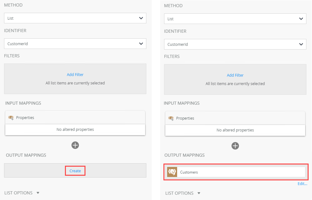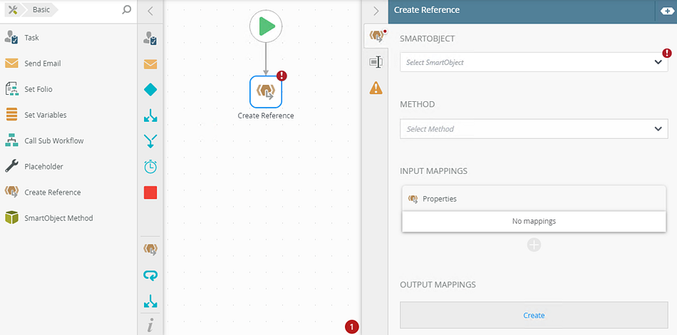 - From the Toolbox, click the Basic category, and then click and drag the Create Reference step onto the canvas. Configure this step to create a reference to a SmartObject list.