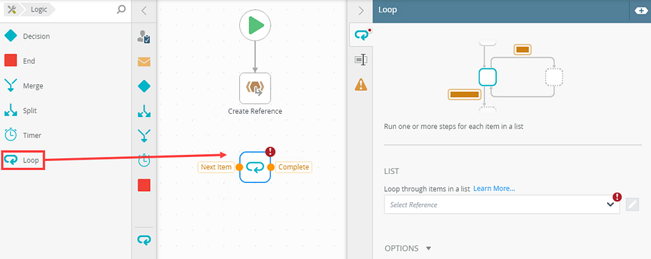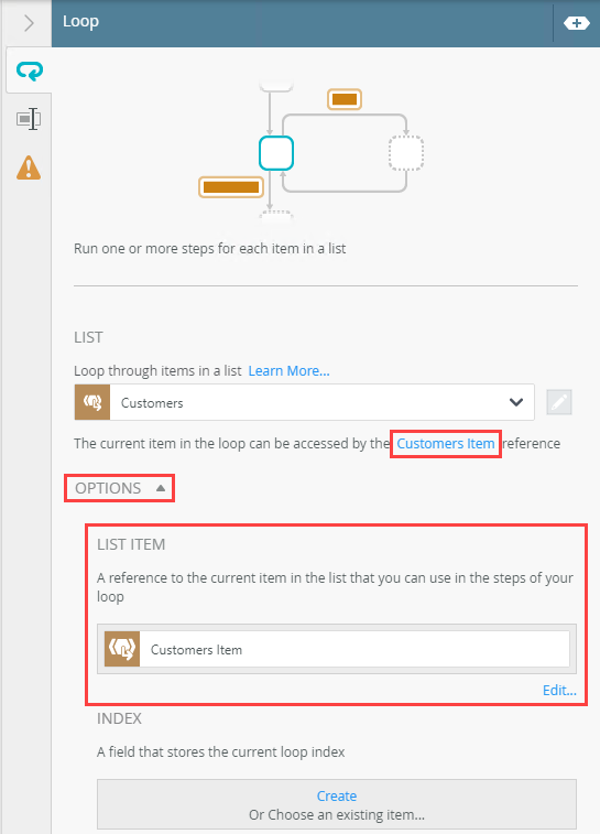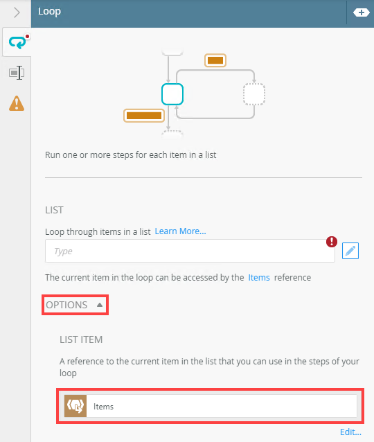 - After you choose a reference, the new list item reference gets created for you. This list item reference is how you can access the current item being processed in the loop step, and will contain properties for the current item. To view the item reference, expand the Options section.