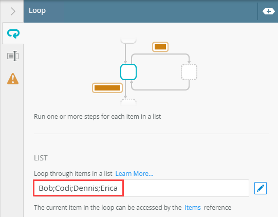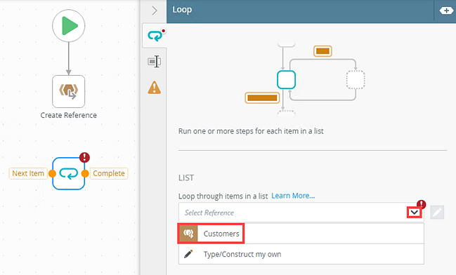 Specify a list to loop through. You can select a reference created within the workflow using a Create Reference step. You can also add a list of static values to loop through. |