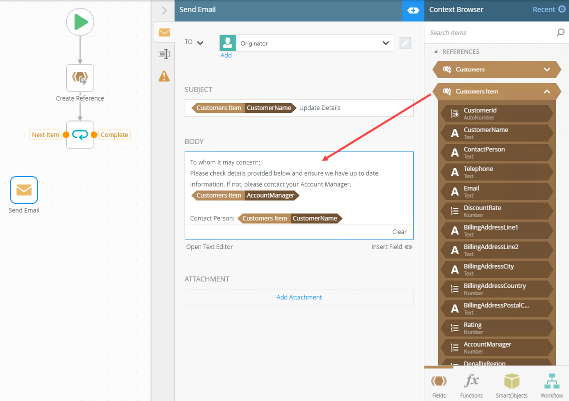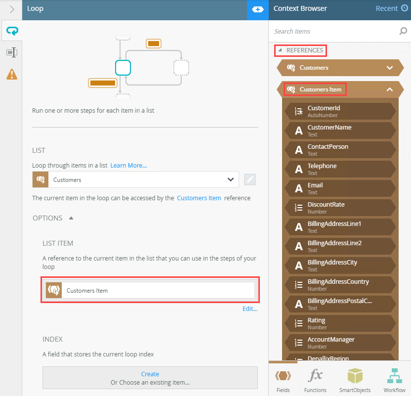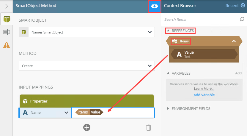 - To locate the added reference, expand the Context Browser, select Fields and then expand the Reference section. Expand the Items reference, click and drag the Value field to the Input Mappings section. This creates the values, specified in the static list on the Loop step, to the Name property in the SmartObject.
