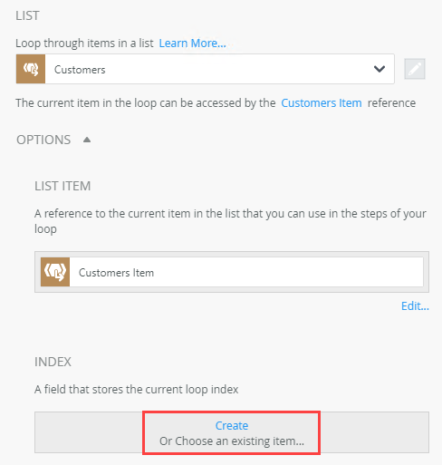 - Click the Create link in the Index section to store the current loop index. You can select an existing index from the Or Choose an existing item... link. If your workflow has multiple loop step configurations, you can select an existing Loop Index. At runtime the selected Loop Index is re-used. You can also select a variable, created in the Context Browser, from the Or Choose an existing item link.