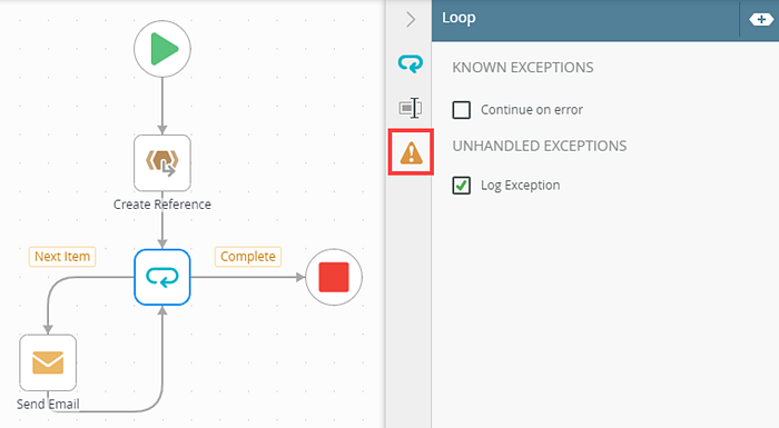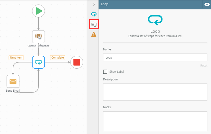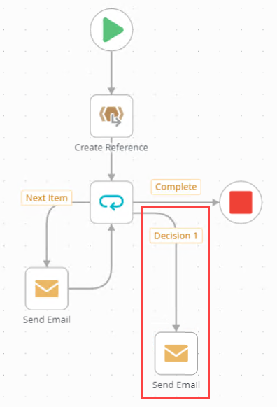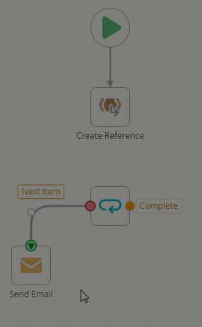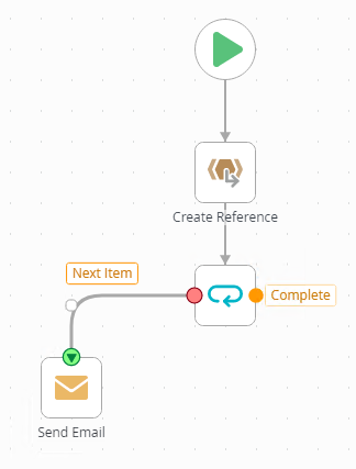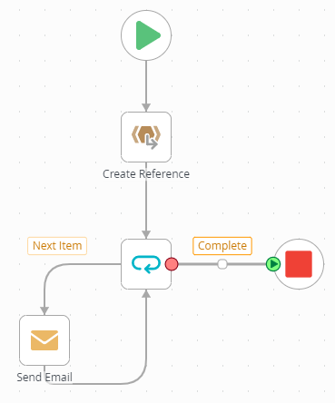 - You can add a non-outcome path to the Loop step if your workflow requires it. However, it is important to keep in mind that the activity connected to this non-outcome path fires with the Next Item outcome until the loop has completed and when the completed path is followed. In this example, a non-outcome path is added to the Loop step. After the reference is created, the Next Item path (Send Email) is followed and loops back to the step. Before the next round of the Loop step starts, the non-outcome path is followed. This means if your Loop step loops through 10 items, the non-outcome path is also followed 10 times. After all items have been looped through, the complete and the non-outcome paths are followed, which means the non-outcome path is followed a total of 11 times.