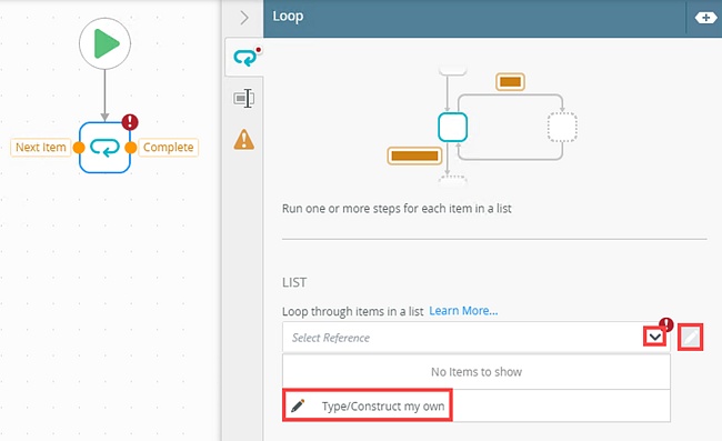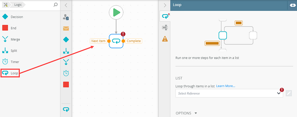 | Item Reference | After selecting the reference from the List menu, the current item in the loop is accessed through the Item Reference. The Item Reference shows below the selected list as a link. This link expands the Options section. | Click the added item reference link to expand the Options section. |
